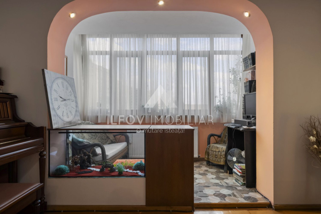 Deși este situat într-o zonă centrală, apartamentul oferă liniște și confort, având vedere către parcul din spatele blocului.