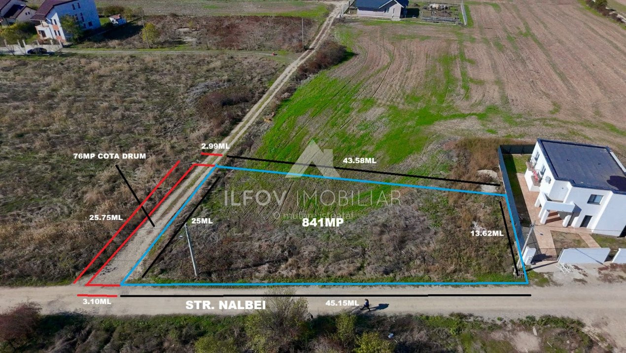 Terenul are o suprafață totală de 841 mp, la care se adaugă 76 mp cota parte din drumul de servitute. Este un teren generos, cu dublă deschidere: 45.15 metri liniari la strada principală – Str. Nalbei – și 25 metri liniari la drumul de servitute lateral. Forma regulată și suprafața plană îl fac ușor de amenajat pentru construcție. Mai mult decât atât, există posibilitatea de dezmembrare în două loturi egale, a câte aproximativ 420.5 mp fiecare, cu acces individual, ceea ce îl transformă într-o investiție ideală pentru dezvoltare dublă sau pentru două familii care doresc să construiască împreună.